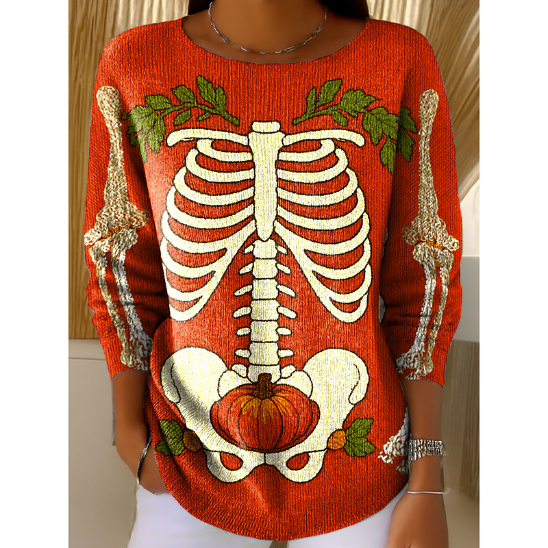 Women's Sweater Skeleton Cute Streetwear Casual Graphic Skeleton Crew Neck Patchwork Knitted Long Sleeve Regular Tops KnitOrange Fall Winter