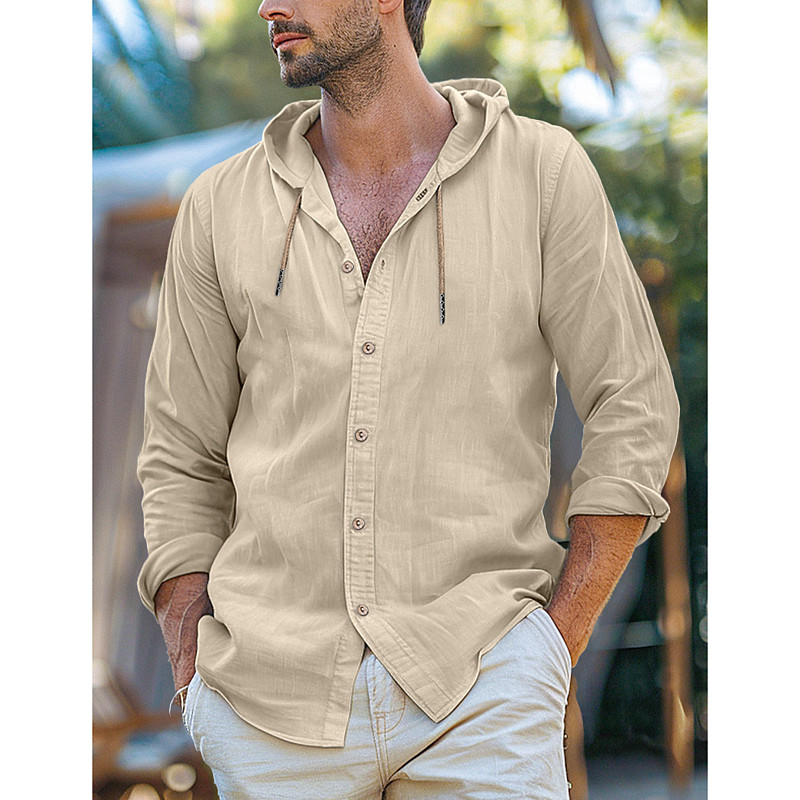 Men's Shirt Linen Shirt Plain Casual Daily Black White Blue Khaki Long Sleeve Hooded Spring Summer Clothing Apparel Buttons