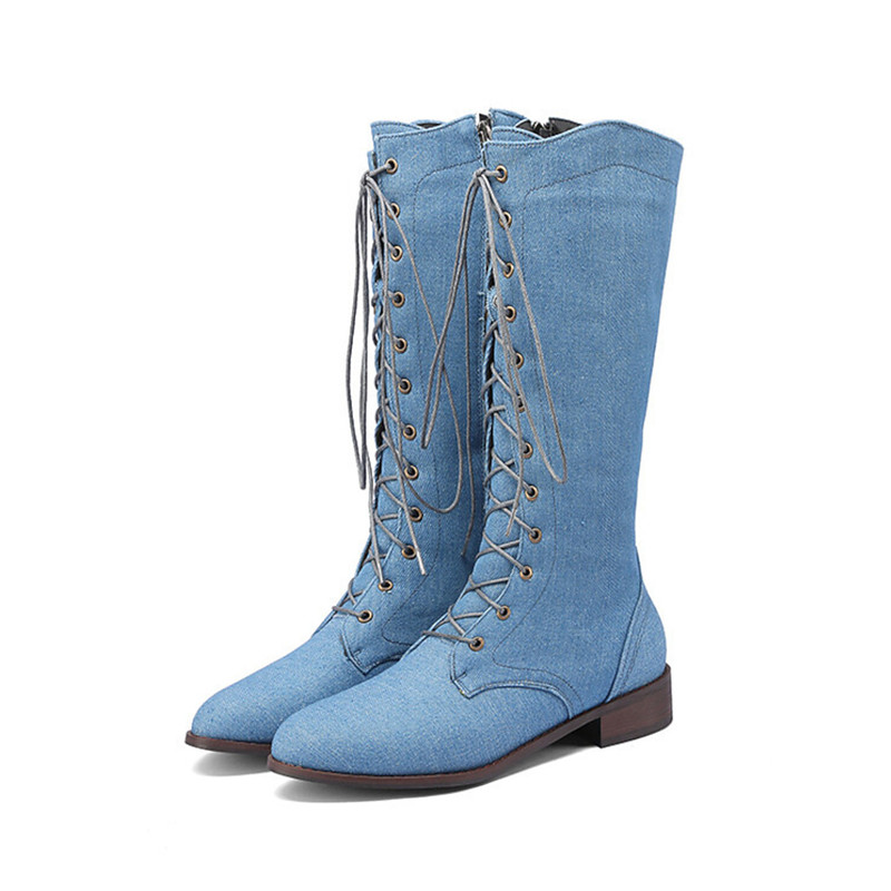 Women's Lace-Up Denim Boots - Casual High-Top Flat Boots for Spring and Fall Fashion, Comfortable and Stylish