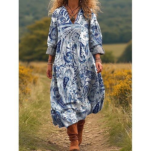 Per donna Abito Midi Abito a Tubino Casual Quotidiano Vestibilità comoda Grafico Paisley Manica Lunga Scollo a V Azzurro cielo Arancione Blu scuro Autunno Inverno