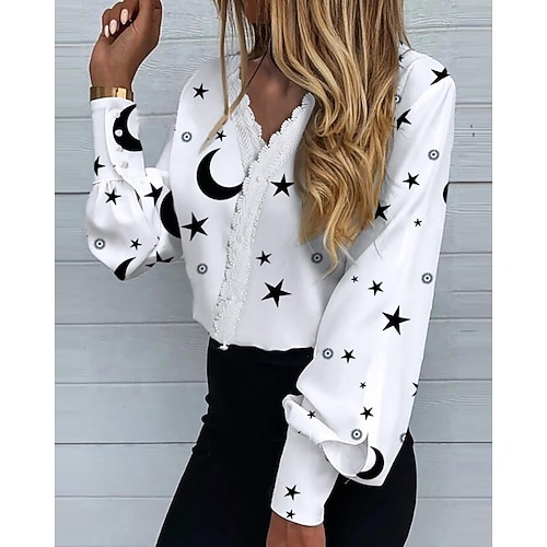 Per donna Blusa Floreale Grafico Elegante Casual Manica Lunga Scollo a V Top Regolari Quotidiano Pizzo Stampato Nero Bianco Rosa Primavera Autunno