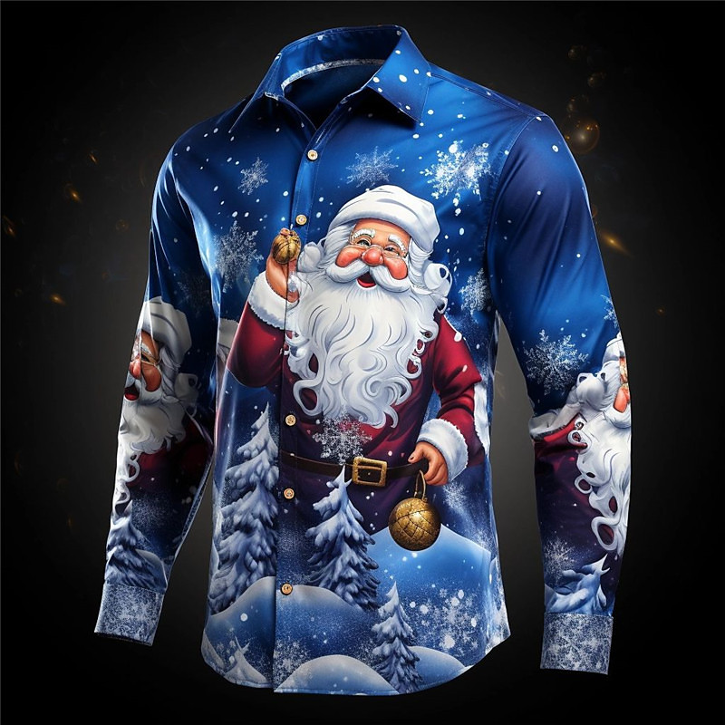 Christmas Men's Santa Claus Printed Shirts Santa Claus Casual Daily Wear Going out Fall Winter Turndown Long Sleeve Navy Blue, Royal Blue, Blue S, M, L 4-Way Stretch Fabric Shirt