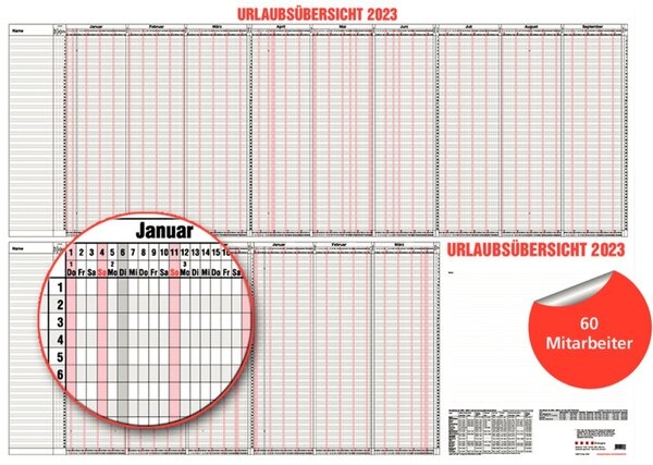 GÜSS Urlaubsübersicht, 15 Monate, für 60 Mitarbeiter, 120 x 84 cm, Spalte Resttage hinter jedem Monat