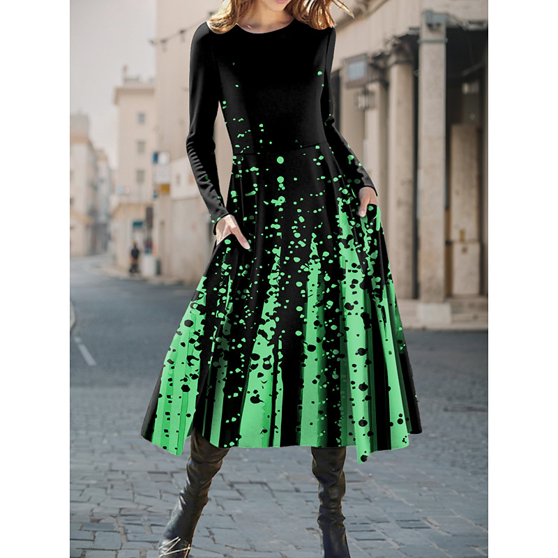 Women's Midi Dress A Line Dress Fit And Flare Dress Casual Daily Regular Fit Graphic Geometric Long Sleeve Crew Neck White Red Blue Purple Fall Winter