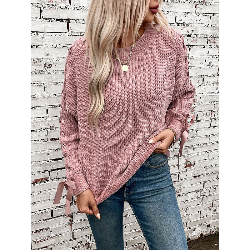 Women's Sweater Casual Soft Pure Color Ribbed Crew Neck Knitted Long Sleeve Regular Tops Knit Outdoor Daily Weekend Pink Wine Fall Winter
