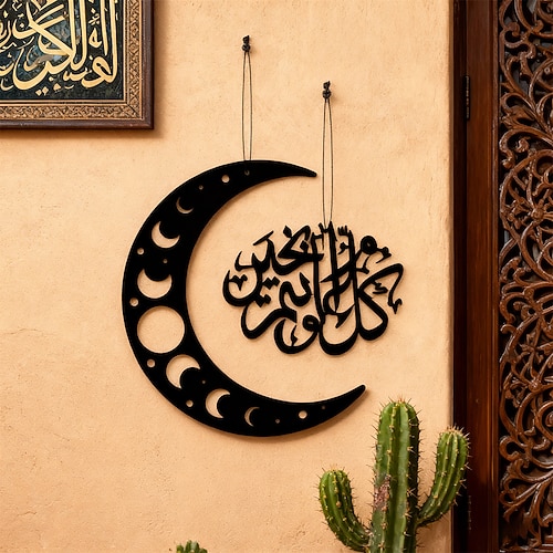 decorazione murale per l'Eid Ramadan: decorazione floreale vintage in legno nero tagliato al laser da appendere a forma di luna, perfetta per feste di famiglia musulmane, celebrazioni del Ramadan e
