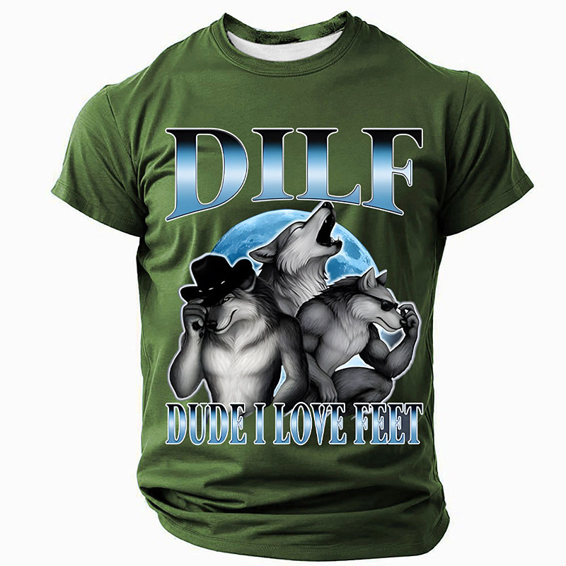 DILF Dude I Love Feet T Shirt Funny Three Wolf Moon Meme Graphic Tee Ironic Internet Humor Gift Clothing Apparel S M L XL XXL XXXL