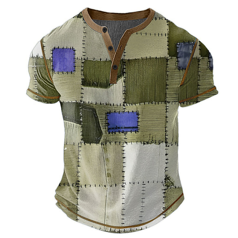 Men's Faux Patchwork Pattern Henley Shirt Waffle T Shirt Short Sleeve Daily Retro Vintage Classic Sports Outdoor Casual Holiday Spring Summer All Seasons Dark Brown Blue Green Grey Henley Henley