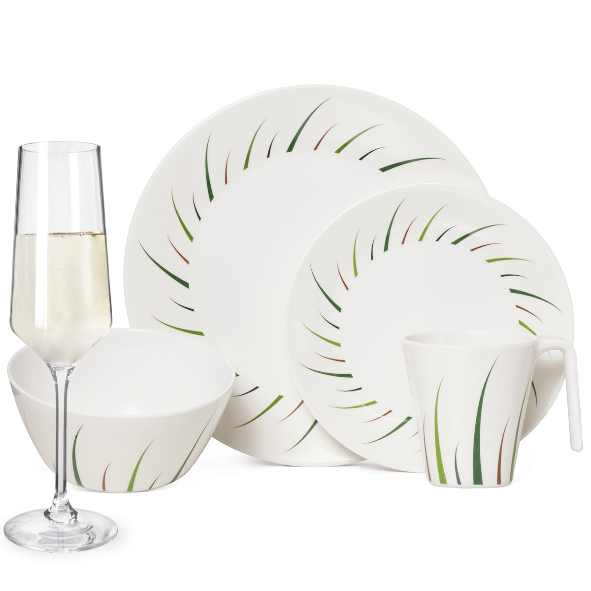 Moritz Melamin Geschirr-Set 4 Personen Limon Design 16 Teilig + Milano Gläser Champagner-Gläser Flûtes Tafelgeschirr Picknick BBQ Kochgeschirr