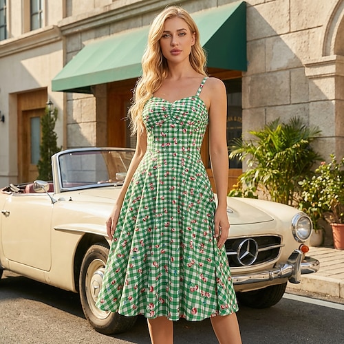 Elegante Anni 1950 Midi Vestito Senza maniche Cinghia per spaghetti Floreale A quadri Linea ad A Collo a cuore Costume Per donna Feste Abbigliamento Quotidiano Casual Quotidiano Adulti Vestito