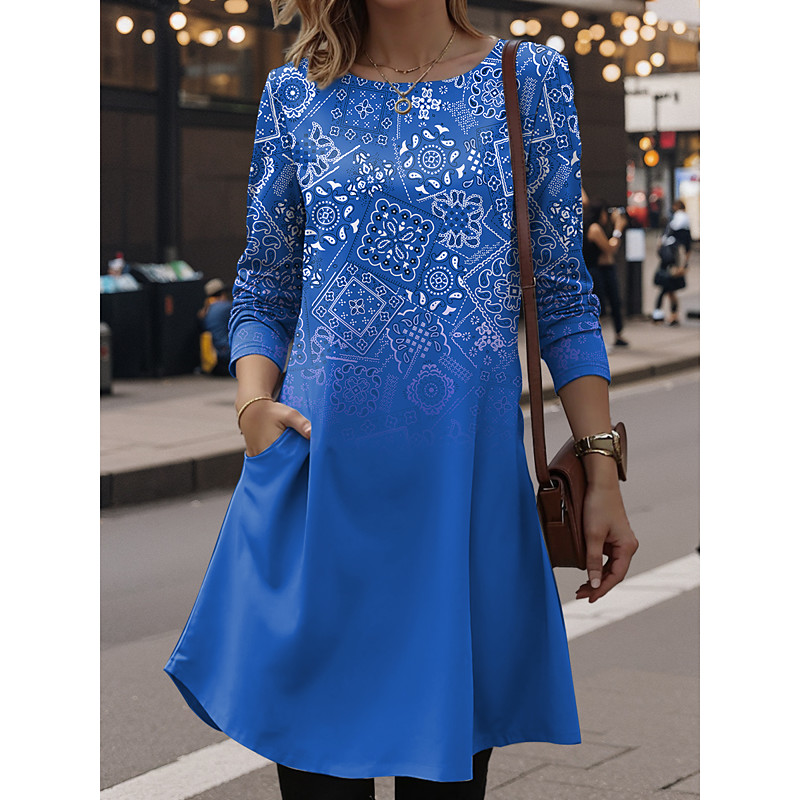 Women's Mini Dress Sweater Dress Shift Dress Party Casual Boho Holiday Going out Regular Fit Graphic Geometric Long Sleeve Crew Neck Blue Royal Blue Light Brown Sky Blue Spring Fall Winter