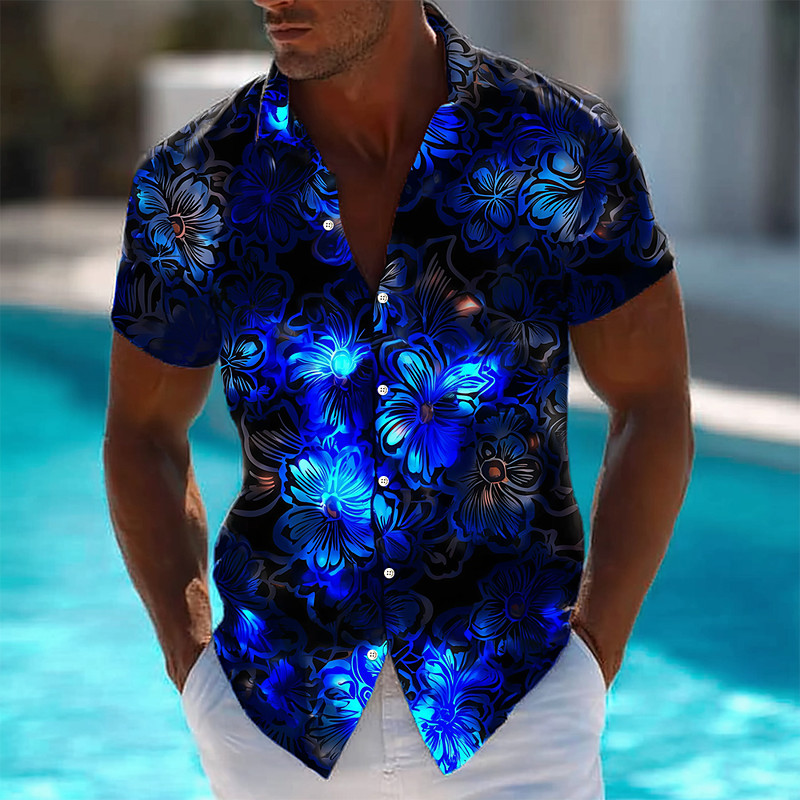 Men's Floral Print Neon Glow Flowers Summer Hawaiian Shirt Button Up Shirt Aloha Shirt Short Sleeve Hawaiian Vacation Beach Wear Summer Spring Turndown 3D Print Collared Shirts Black 1 Black