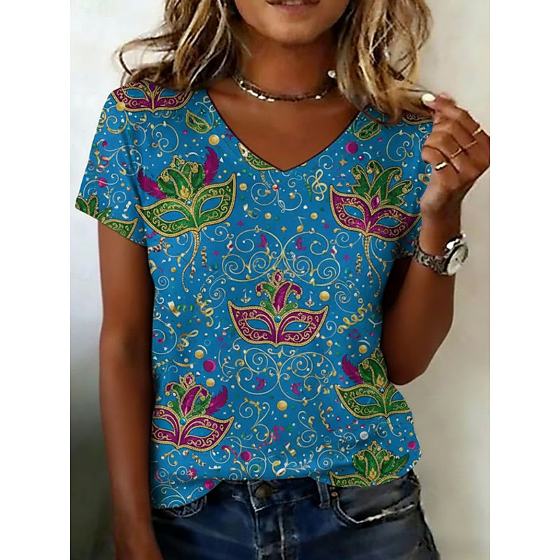 Carnival Women's T Shirt Graphic Vintage Casual Short Sleeve V Neck Regular Tops Daily Weekend Vacation Wear Print Blue Summer Spring