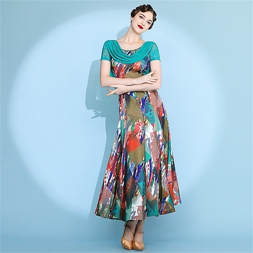 abito da ballo da sala con stampa astratta colorata per donna - abito a trapezio con maniche corte e scollo a barchetta per competizioni, eventi di danza latina e danza