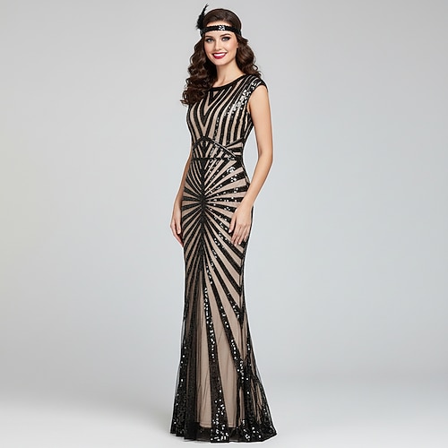 Retrò Vintage Anni Ruggenti Anni 1920 Lunghezza alla caviglia Vestito Abito da sera Maniche corte Il grande Gatsby Invitato al matrimonio Paillettes Scollo a V Costume Per donna Mascherata Matrimonio