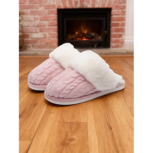 pantofole da casa da donna in maglia rosa con colletto in pelliccia sintetica: calde pantofole da infilare per la camera da letto, la spa e il relax in casa