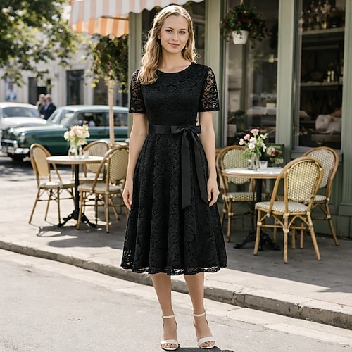 Elegante Anni 1950 Midi Vestito Maniche corte Pizzo Fiocco Floreale Linea ad A Girocollo Costume Per donna Casuale Feste Abbigliamento Quotidiano Adulti Vestito 1 cintura Primavera Estate