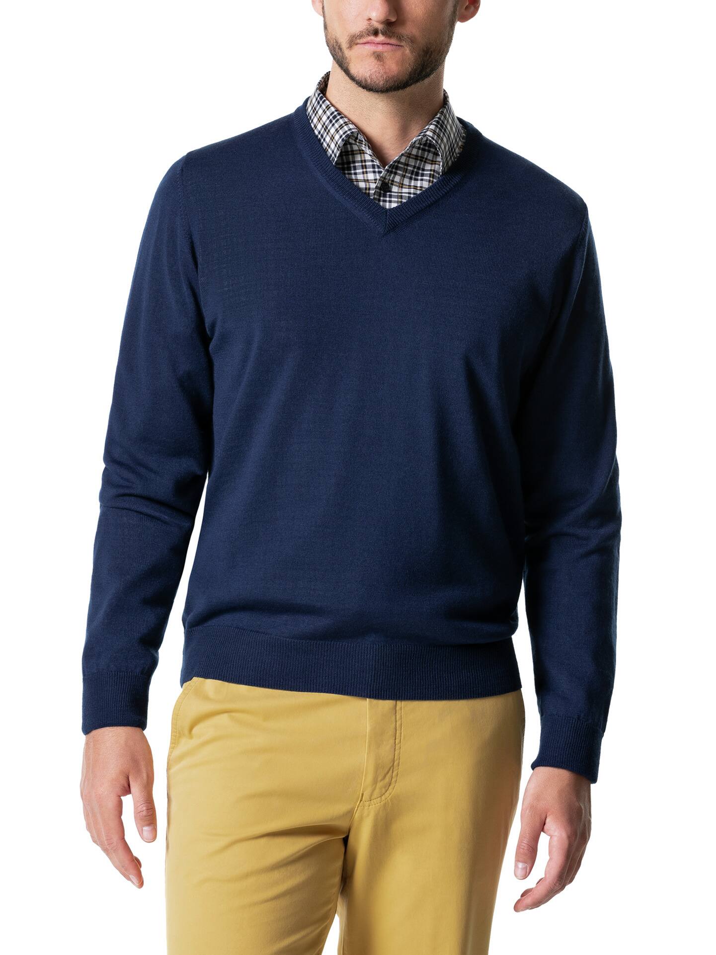 Walbusch Herren Merino-Mix V-Pullover Blau