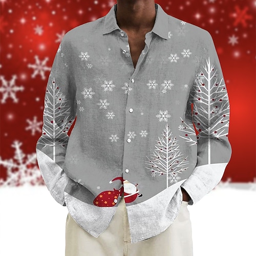 Weihnachtshemden, Herrenhemd, Baum, Weihnachtsmann, Schneeflocke, Turndown, grau, 3D-Druck, Weihnachten, Straße, lange Ärmel, Button-Down-Druck, Kleidung, Mode, Designer, lässig