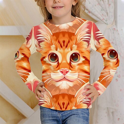 Mädchen 3D Tiermotiv Katze T-Shirt Langarm Frühling Herbst Mode Basic Kinder 4-12 Jahre Rundhalsausschnitt Outdoor Lässig Täglich Normale Passform