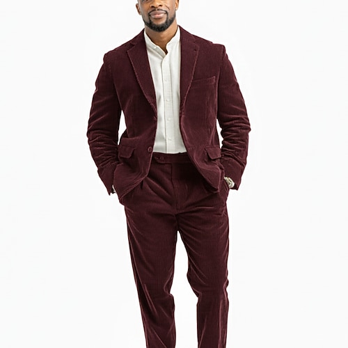 Herren Party Cordanzug Gekerbtes Revers Schwarz Burgunderrot Mode Lässig Einfarbig Figurbetonter Schnitt 2-teilig Einreihige Zwei-Knopf-Jacke