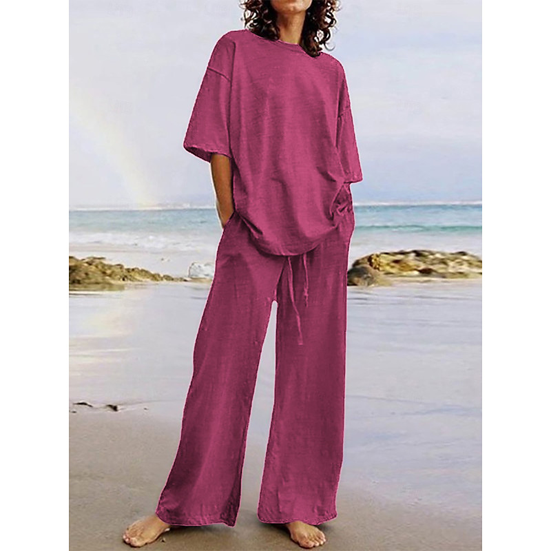 Women's Cotton Linen Sets Two Piece Sets Basic Pure Color Pocket Elastic Waist T Shirt Pant Street Daily Long Sleeve Crew Neck Black White Navy Blue Light Brown Blue Summer Spring