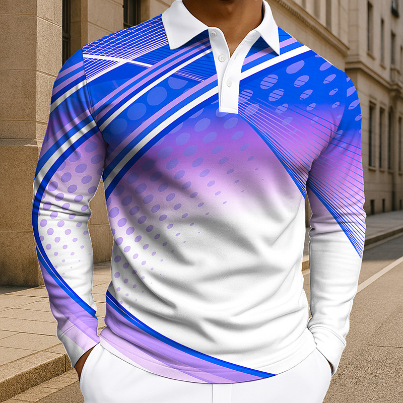 Men's Geometic Line Polo Long Sleeve Polo Shirts Lapel Business Casual Athleisure Daily Wear 3D Print Buttons Spring Fall Winter Lake blue Dark Pink Blue