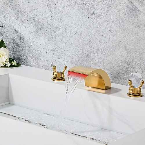Rubinetto miscelatore per lavabo da bagno a cascata con luce LED dorata lucida, rubinetto a 3 fori per montaggio su piano con 2 maniglie, luce LED a LED a colori variabili alimentata ad acqua, corpo in ottone massiccio, valvola in ceramica,...