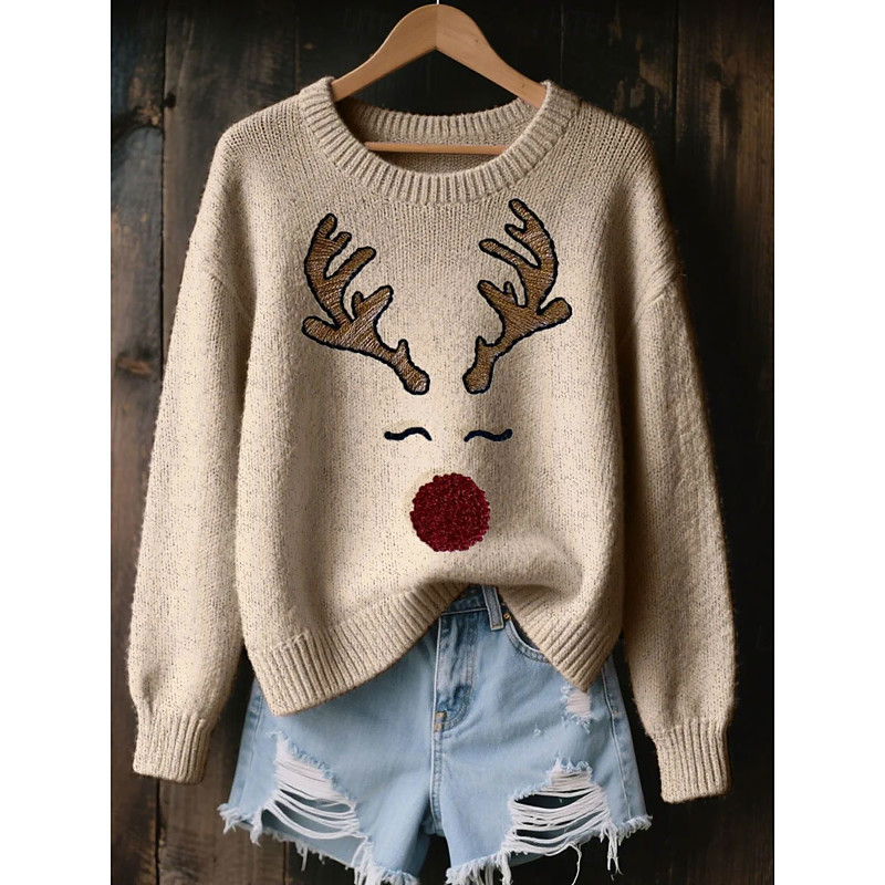 Christmas Women's Reindeer Sweater Pullover Daily Casual Graphic Ribbed Crew Neck Knitted Print Long Sleeve Regular Tops Knit Outdoor Weekend Khaki Fall Winter