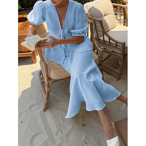 Per donna Set di biancheria in cotone Set da due pezzi Set di gonne Manica Corta Manica a Palloncino Scollo a V Tinta unica Peplo Elegante Moda Streetwear Casuale Quotidiano Lavoro Blu Bianco Giallo