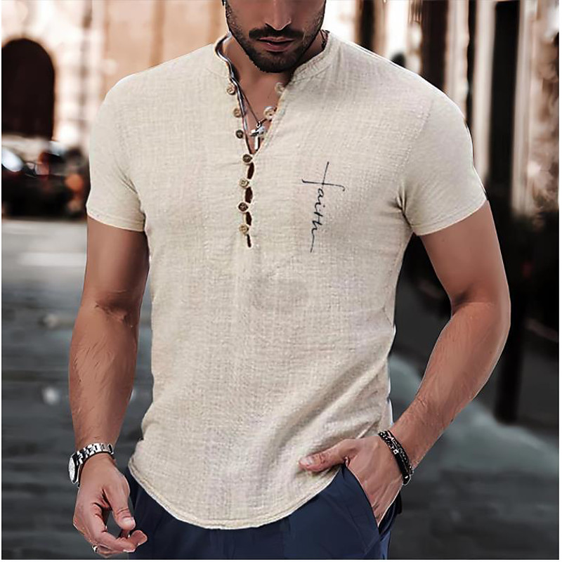 Men's Shirt Popover Shirt Summer Shirt Casual Shirt Button Up Shirt Light Green Purple khaki Light Grey Light Blue Short Sleeve Faith Solid / Plain Color Band Collar Henley Vacation Hawaiian Buckle