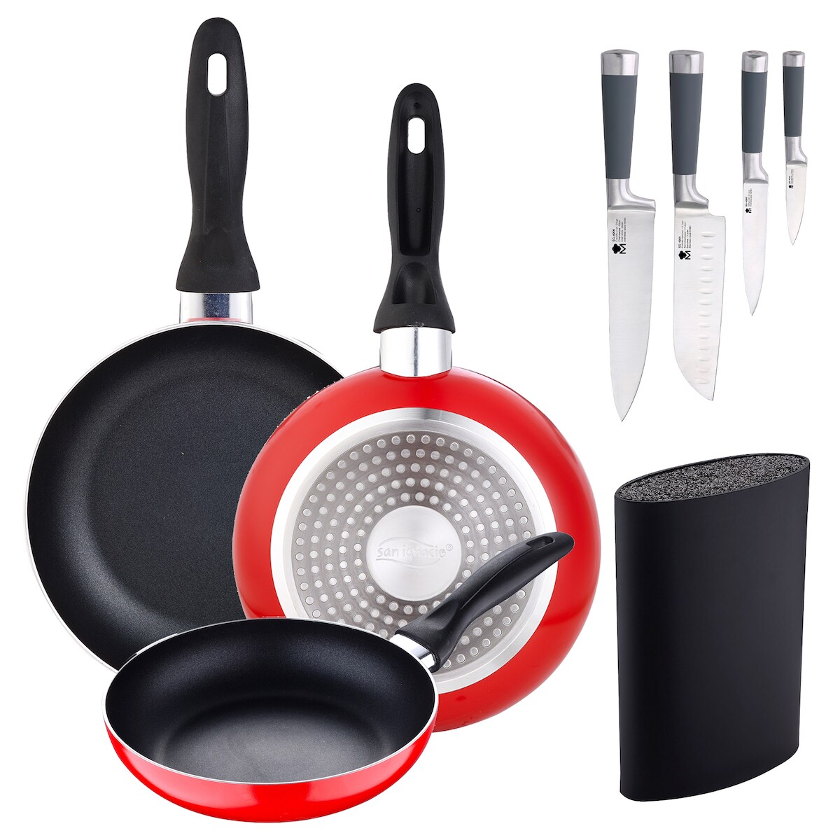 San Ignacio - Set aus 3 Pfannen aus gepresstem Aluminium Ø16/20/24 cm mit Tacoma und Set 4 Küchenmesser.