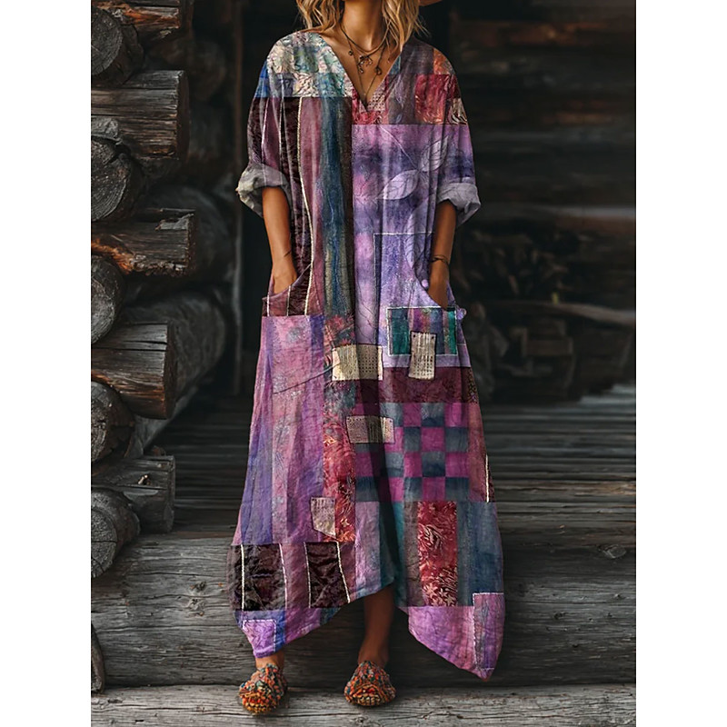 Women's Midi Dress Maxi Dress A Line Dress Vacation Casual Loose Fit Graphic Geometric Abstract Long Sleeve V Neck Blue Purple Green Beige Spring Fall
