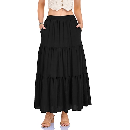 Per donna Gonna da vacanza Moda Essenziale Casual Maxi Vita Alta Gonne Semplice Arricciato Tasca Inelastico Quotidiano Nero Bianco Blu marino Marrone Estate Cotone Lino