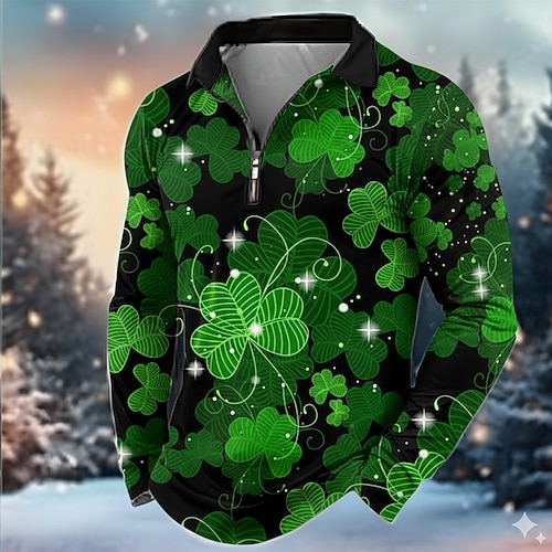 San Patrizio Per uomo Trifoglio Polo Manica Lunga Collo ripiegato Moderno Tempo libero Athleisure Casual Quotidiano Festival Cerniera Stampa 3D Primavera Autunno Nero Bianco Verde