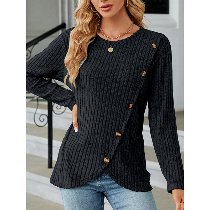 Women's T Shirt Plain Fashion Modern Casual Long Sleeve Crew Neck Regular Tops Daily Weekend Buttons Fuchsia Brown Green Fall Winter
