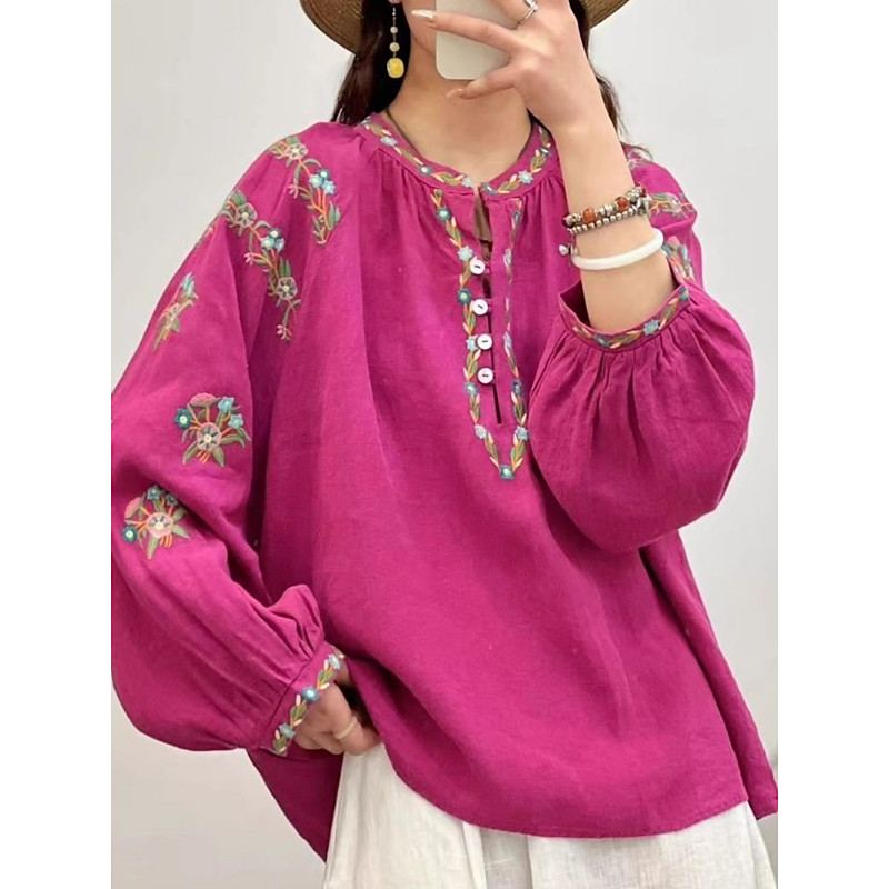 Women's Cotton Linen Shirts Floral Basic Casual Long Sleeve Crew Neck Regular Tops Daily Embroidered Pink Fuchsia Green Beige Summer Spring Fall