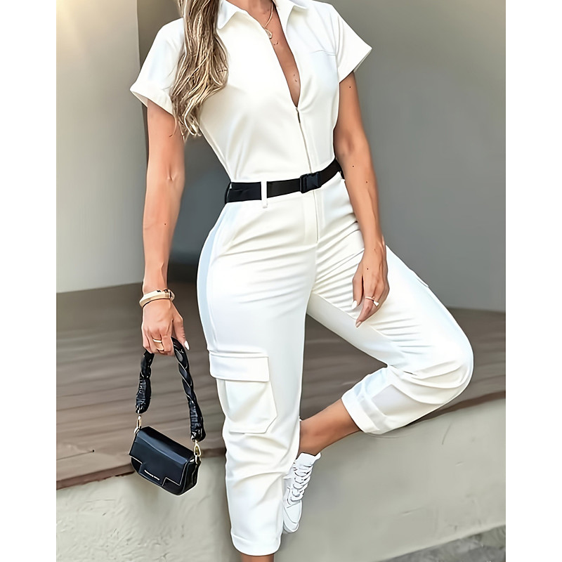 Women's Normal Jumpsuit Streetwear Solid Color Short Sleeve Cargo Pants Shirt Collar Pocket Street Daily Regular Fit Black White Khaki Fall
