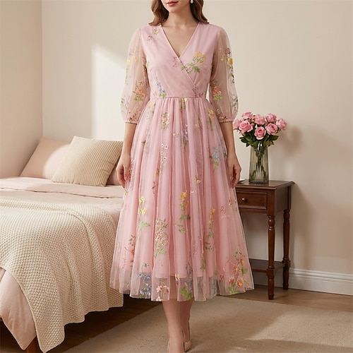 Elegante Vintage Anni 1950 Midi Vestito Maniche corte Ricamato Floreale Linea ad A Scollo a V Costume Per donna Festa serale Tè Adulti Vestito Primavera Estate