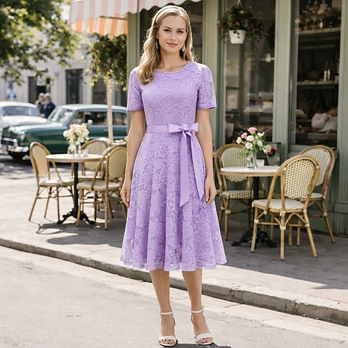 Elegante Anni 1950 Midi Vestito Maniche corte Pizzo Fiocco Floreale Linea ad A Girocollo Costume Per donna Casuale Feste Abbigliamento Quotidiano Adulti Vestito 1 cintura Primavera Estate