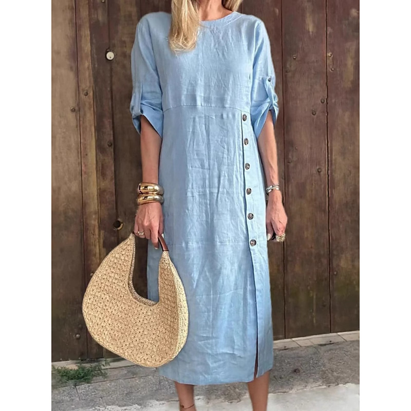 Women's Midi Dress Casual Dress Cotton Linen Dress Basic Modern Daily Weekend Regular Fit Plain 3/4 Length Sleeve Crew Neck Blue Black Yellow Brown Summer Spring Fall