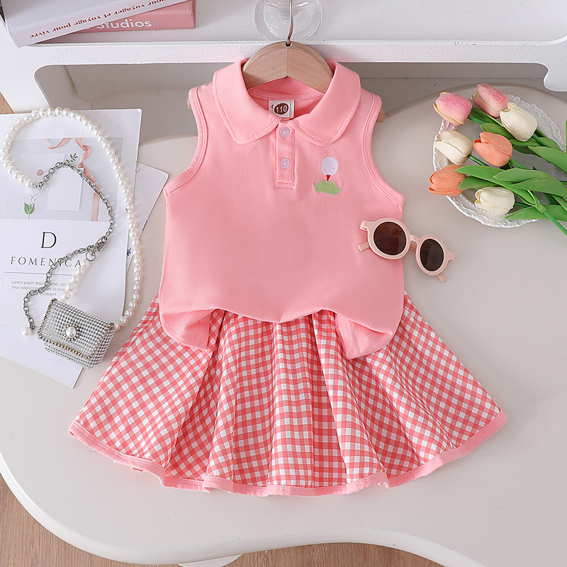Girls' 3D Plaid T-shirt Skirt Pink Sleeveless Other Prints Summer Casual Toddler 1-5 Years Crew Neck Outdoor