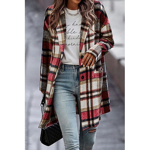 Per donna Cappotto Invernale Giacca Invernale Confortevole Traspirante Tasca Stampato Casual Plaid Vacanza Streetwear Casuale Abbigliamento quotidiano Monopetto Lungo Collo ripiegato Vestibilit