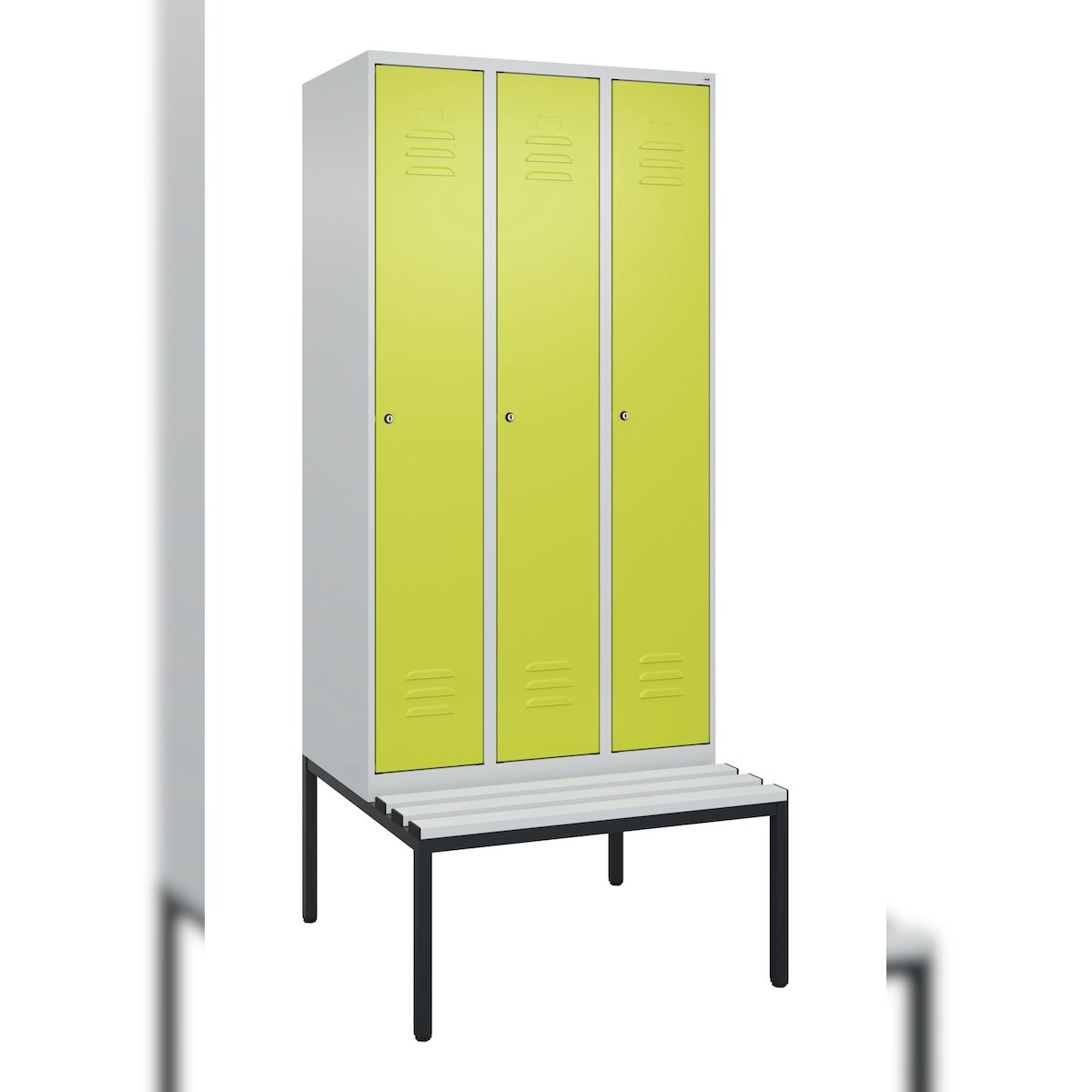 C+P Spind Classic PLUS, Kunststoff untergebaute Sitzbank, 3 Abteile, HxBxT 212x90x82cm, Zylinderschloss, Hellgrau/Clowngrün von PROREGAL