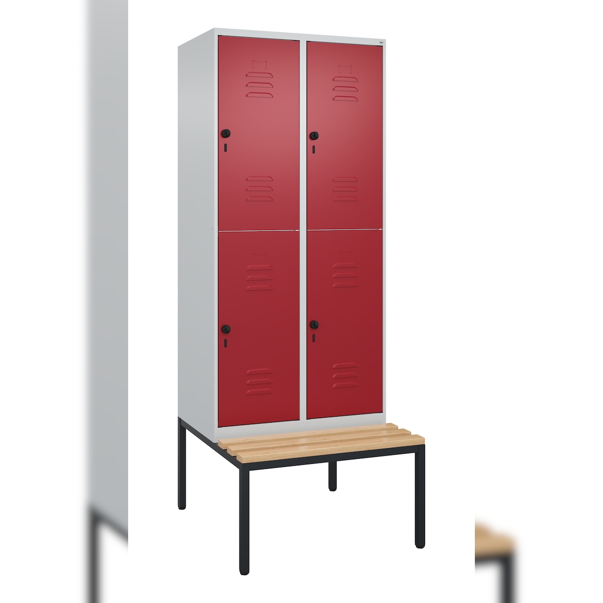 C+P Z-Spind Classic PLUS, schwebender Sitzbank aus Buche 8 Abteile, HxBxT 212x120x82cm, Sicherheitsdrehriegel, Hellgrau/Rubinrot von PROREGAL