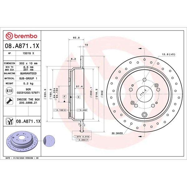 Jarrulevy Vakiomalli, Taka-akseli Brembo 08.A871.1X - honda cr-v iii, cr-v iv - OE 42510SWWG01, 42510T1GG00, 42510T1GG01