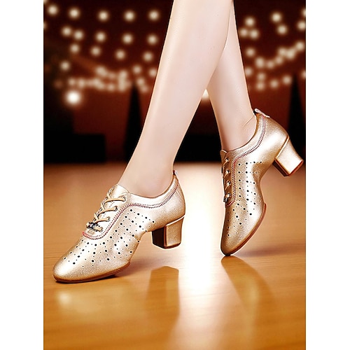 Goldene Damen-Tanzschuhe zum Schnüren – bequeme Jazz- und Ballsaal-Übungsschuhe mit niedrigem Blockabsatz für Auftritte und Training