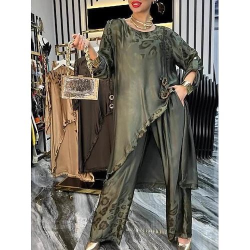 Per donna Set di Pantaloni Bolero Top Manica Lunga Girocollo Leopardo Arricciato Elegante Moda Streetwear All'aperto Vacanza Ferie Verde militare Marrone Cachi Estate Vestibilità comoda