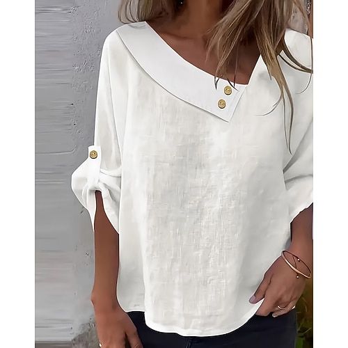 Per donna Camicie di cotone e lino Semplice Quotidiano Moderno Manica 3/4 Girocollo Top Regolari Quotidiano Ferie Allacciato Bianco Azzurro cielo Grigio Estate