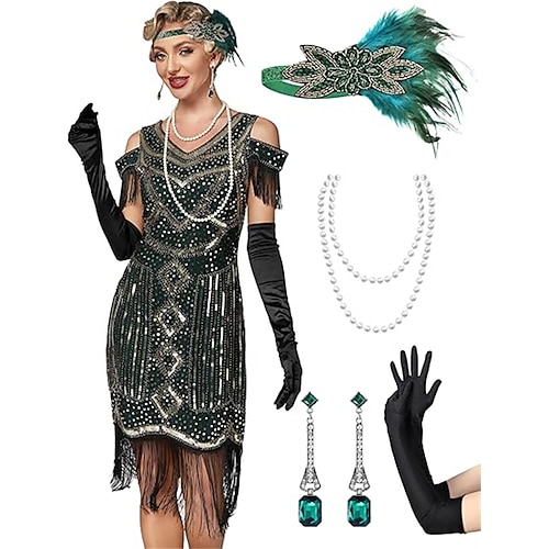 Set Anni Ruggenti Anni 1920 Abito da cocktail Lunghezza al ginocchio Abito Flapper Vestito Abiti con accessori Spalle scoperte Maniche corte Il grande Gatsby Charleston Paillettes Frangia con nappe